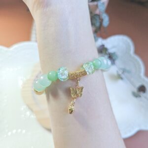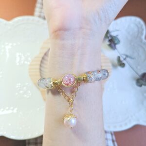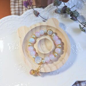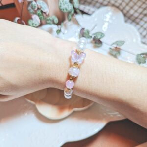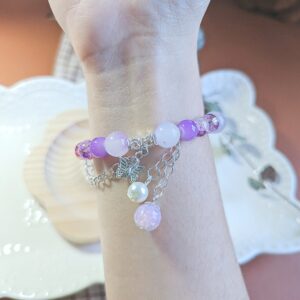 This dreamy bracelet has a delicate bow crafted from mini glass beads. which gracefully hangs as a centerpiece. Adorned with soft frosted beads and periwinkle-colored faux pearl glass beads, this piece exudes an air of elegance and enchantment.