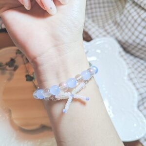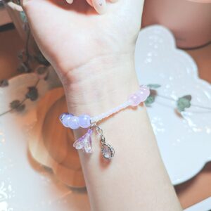 This white pearl bracelet, delicately adorned with hints of lavender hues through glass beads and a charming butterfly glass charm. Accentuated with delicate 14k gold plated hardware.